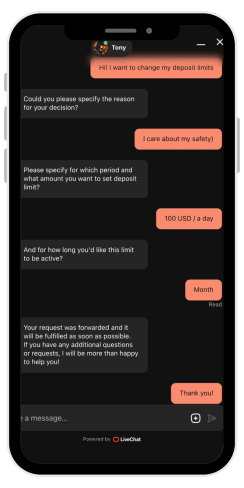 تتضمن الدردشة المباشرة وضعين - التفاعل مع الروبوت والتواصل مع وكيل مباشر. عند استخدام الروبوت، يمكن للاعبين اختيار فئة الأسئلة: مكافآت الإيداع، أو عروض ترويجية أخرى، أو برنامج VIP، أو الإيداع/السحب، أو اعرف عميلك/التحقق، أو الشروط والأحكام، أو مشكلة رهان الكازينو، أو حسابي، أو أسئلة أخرى، أو هل يمكنني اللعب هنا، أو مشاركة التعليقات.